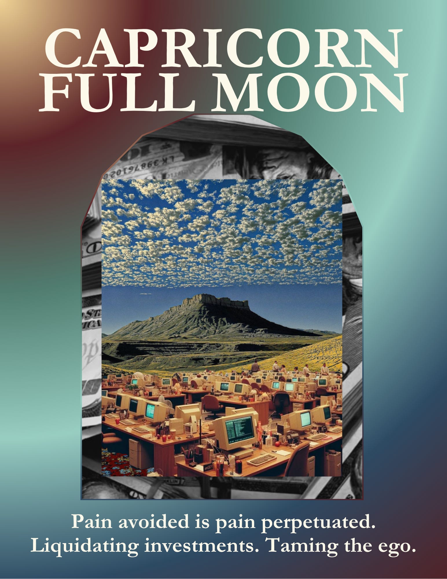 This is a focal point of this full moon, as the moon in Capricorn is a master of emotional resilience—their tolerance for emotional pain is typically higher than the other moon signs. However, this is a skill they develop not because they want to but because they have to; their emotional environment is usually one that makes them grow up faster than they wanted to, to some degree. Through this moon, we are being reminded of the importance of auditing our lives, our methods for managing emotional burdens, and our longest-standing investments so that we might ensure we are still honoring the heart’s calling and are not maintaining things out of obligation, fear of loss, or attachment to security. This is a moon in which we are examining how we can make decisions for our future selves, which may involve a bit of temporary discomfort, but we will find that they were ultimately worth the pain when we see the bigger picture. This may be an important time for us to put our sensitivities to the side so that we can have those challenging conversations, make any necessary alterations to our material lives, and re-evaluate where our resources are going so that we can proceed with a clearer path to the future we feel destined for.
