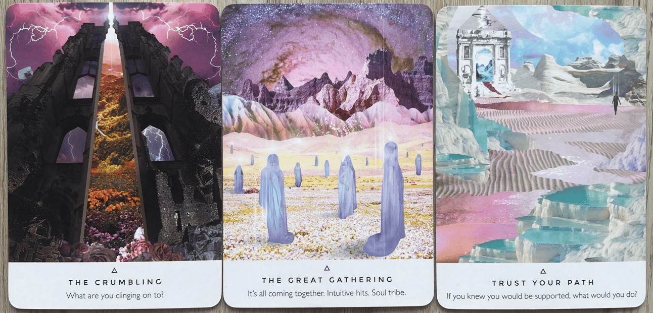 I also sense a reference to soul contracts or spiritual agreements being fulfilled with the second card’s presence. Whenever I see that card, I always think of the figures in it as our souls congregating together on the astral plane. It makes me think of how the soul knows what needs to happen even if the human consciousness cannot comprehend why it’s happening. It’s a reminder that these changes or shifts, however drastic they may feel, have always been a part of the plan and an invitation for us to not worry ourselves so much about how everything will unfold. I find myself encountering quite a bit of resistance when typing that, as my own ego wishes so badly to be able to do something to change the things I’m currently grappling with. But with the current astrological energies at play, and not just those of this week but of the entire summer, things are rapidly evolving, which means that the ego may be having a hard time holding on for the ride. This season is one of tough love; remember, you can only become aligned with things that you are ready for, and you are only given challenges that you are capable of facing. The universe would never give you something you weren’t ready to experience, and that applies to both enjoyable and unenjoyable experiences. The final card feels quite straightforward—things are coming together just as they need to. There’s an invitation for us to stop worrying so much (easier said than done, but still) as things are falling into place just as they’re meant to. It reminds me of that saying, “When things feel like they’re falling apart, they’re actually falling into place,” or however it goes.